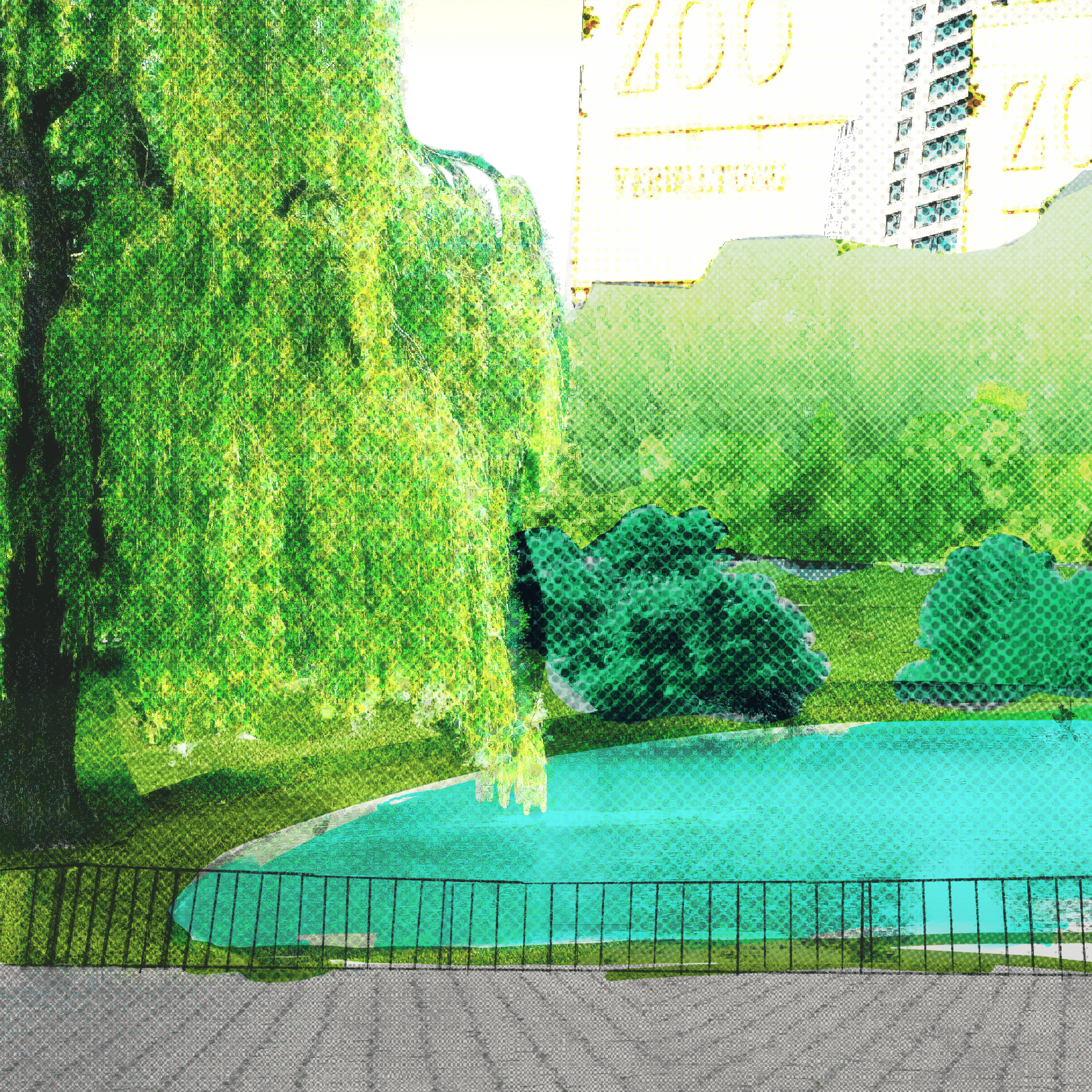 Billie and Bluma interact with various animals at the Zoo: Billie stands on one leg like a flamingo, Bluma scratches her armpits like a chimp, they watch an elephant defecate and look at each other awkwardly.